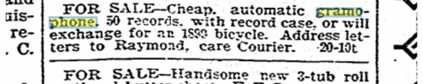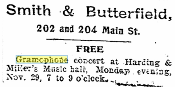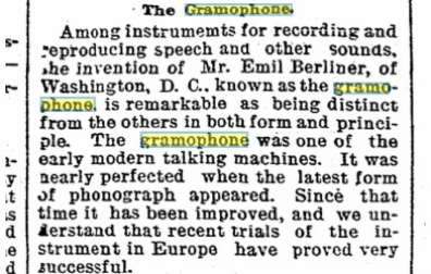The following are articles of advertisements, concerts, and historical information about the gramophone from Evansville newspapers from the 1890s: